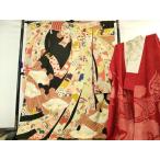 平和屋本店■極上 アンティーク 大正ロマン 振袖・長襦袢(袷・半衿刺繍)セット 駒刺繍 束ね熨斗飛鶴文 黒地 金彩 逸品 DZAA6427kh5
