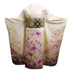 【中古】振袖 7点フルセット M〜Lサイズ 振袖セット 振袖フルセット フルセット 成人式 着物 晴れ着 黄 クリーム ピンク ぼかし 古典 古典柄 菊 淡色 帯 帯揚げ 重衿 半衿 帯締め 結婚式 ブライダル 十三参り F-116