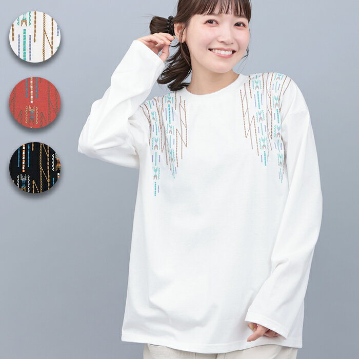 チマヨステッチロングTシャツ / ロングTシャツ レディース 秋 冬 長袖 クルーネック チマヨ刺繍 刺しゅう カラフル トップス カットソー プルオーバー オフホワイト レッド ブラック アメカジ 古着風 ヴィンテージ エスニック チチカカ TITICACA
