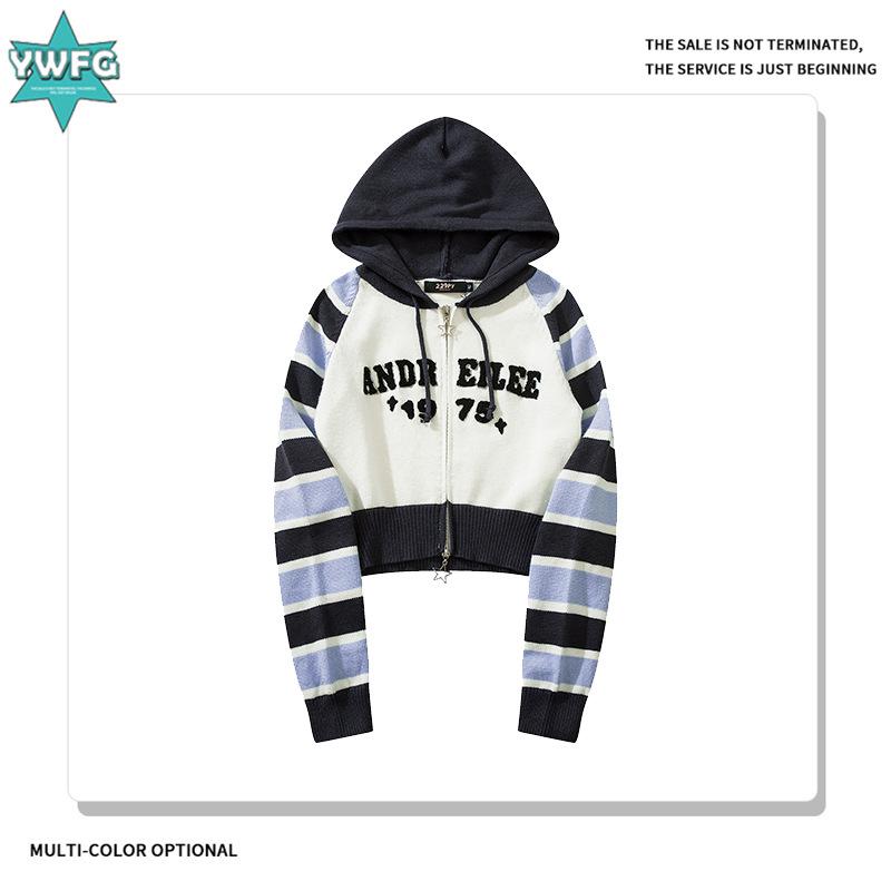 ニット レディース カーディガン ストライプ 長袖 春物 フード付き ピンク系 ブルー かわいい レトロ 古着風 トップス 普段使い(x40)