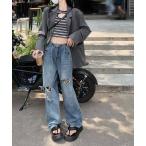 ジーンズ レディース Y2K デニム ワイド ストレート ゆったり 古着風 切り替え ダメージ加工 黒 春 普段使い