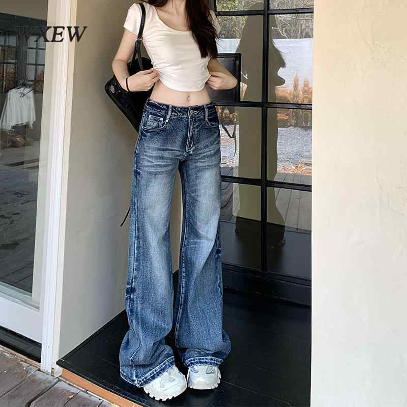デニム レディース ローライズ ブーツカット ジーンズ ジーパン Gパン ウォッシュ加工 美脚 脚長効果 ゆったり ストレート ワイド レトロ 古着風 アメカジ 裾広がり 70年代 80年代