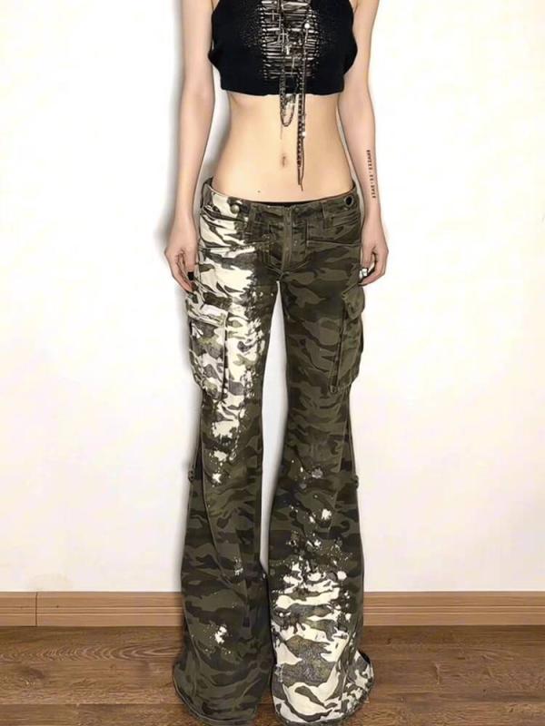 ジーンズ レディース ペイント 迷彩柄 デニム ワークパンツ ローライズ ブーツカット ストレート ロングパンツ ダメージ加工 古着風
