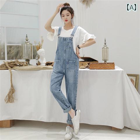 デニム オーバーオール【シンプル アメカジ ストリート系 定番 ナチュラル レディース 森ガール ウォッシュ加工 ユーズド加工 メンズライク レディース 大きいサイズ 古着風 ジーンズ 定番 M L ネイビー ロールアップ オールインワン】 韓国 広 脚