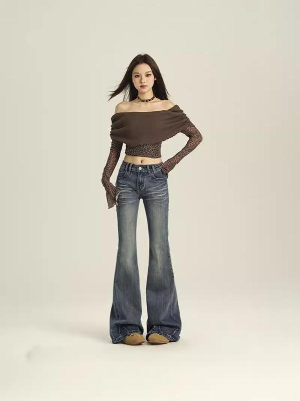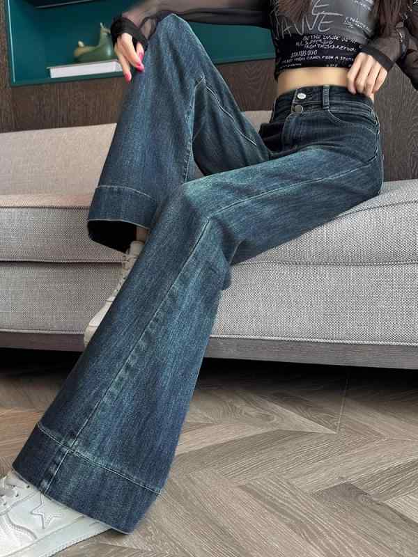 デニム レディース ローライズ ベルボトム ジーンズ ジーパン ウォッシュ加工 ストレッチ 伸縮 文芸 レトロ 古着風 スリム タイト 美脚 脚長 80%綿 普段使い