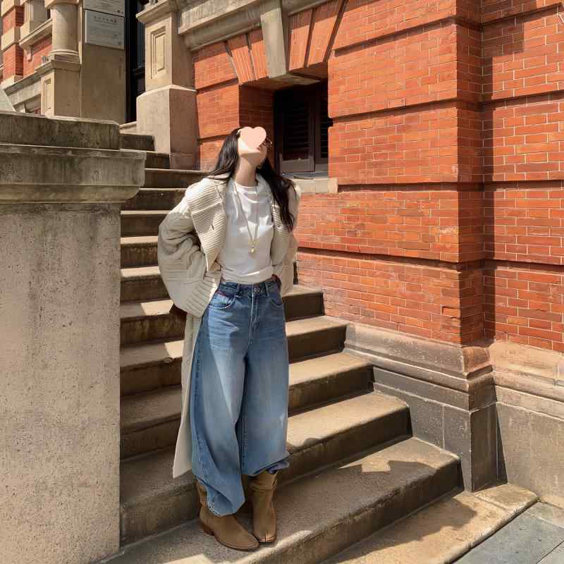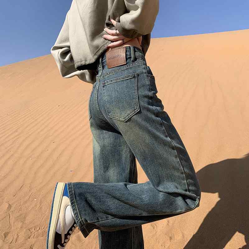 送料無料 ブリーチデニムパンツ メンズライクジーンズ ストリート系 体型カバーボトムス 美脚脚長 着やせ セミワイドデニム 韓国風 ヴィンテージ古着風 ハイウエストズボン ビンテージ デニム