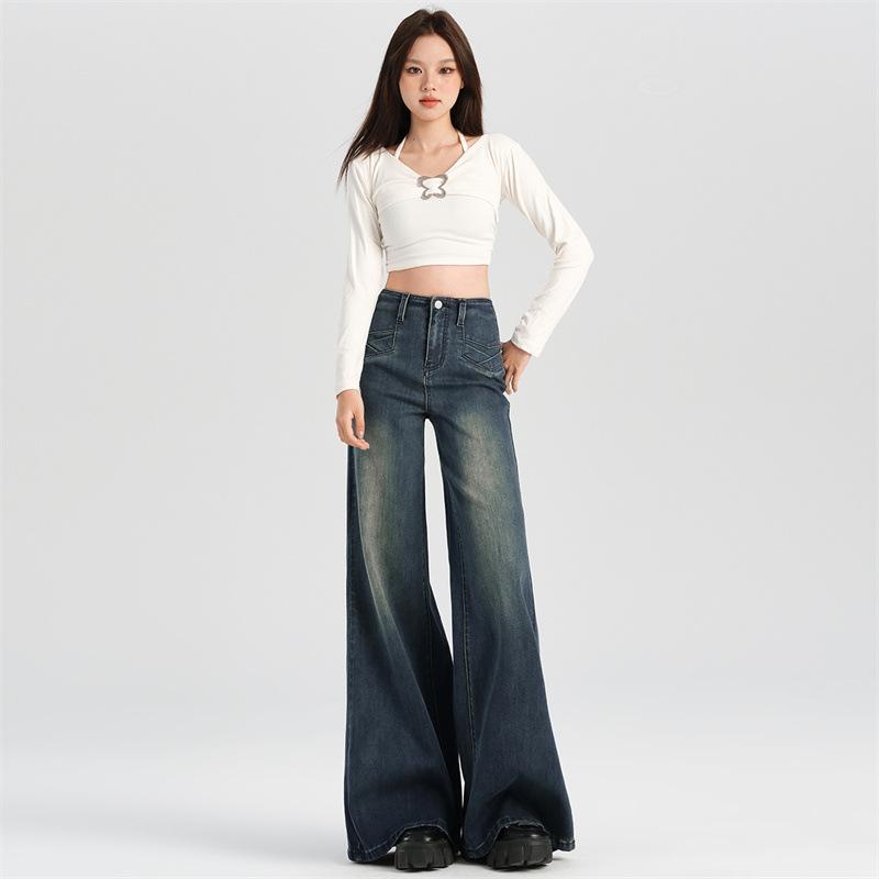 ジーンズ レディース 高腰 ストレート ワイドレッグパンツ ジーパン デニムパンツ ロングパンツ ゆったり ルーズフィット 美脚 脚長効果 ウォッシュ加工 古着風 秋冬