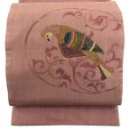 袋名古屋帯 優品 紬地 鳥 唐草 ピンク 正絹 中古