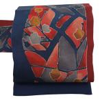 名古屋帯 優品 幾何学模様 縮緬 紺色 正絹 中古