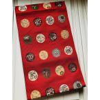 名古屋帯 優品 片輪車 蝶 箔 朱色 正絹 中古