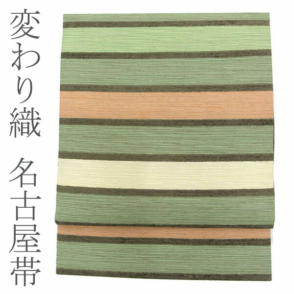 30%OFFで買えます¥28380→19866 【新古品】 名古屋帯 九寸 全通 正絹 変わり織 ボーダー グリーン 緑 オレンジ アイボリー カジュアル 春 秋 冬 未使用 仕立て上がり みやがわ sb50042