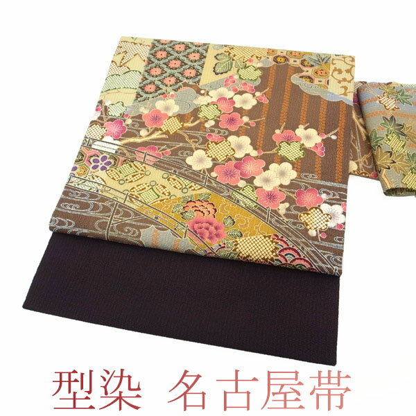 30%OFFで買えます¥29480→20636 【新古品】 名古屋帯 未使用 全通 正絹 浜ちりめん 縮緬 型染 手染め 四季の花 古典 ブラウン グレー 多彩 セミフォーマル カジュアル 春 秋 冬 仕立て上がり みやがわ sb9782