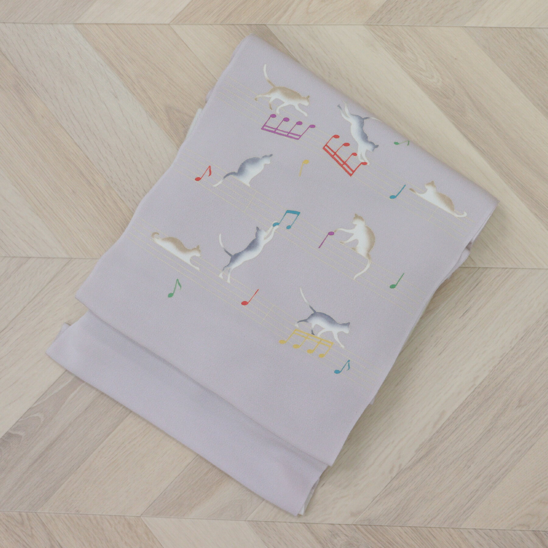 【20%OFF】生地 反物 いわと古代 帯 仕立て 日本製 オーダーメイド 猫 別注 お誂え ラベンダー 薄紫 赤 紫 ねこ ネコ 音符 九寸名古屋帯 九寸帯 なごや 浜ちりめん 縮緬染め帯 未仕立て お仕立て代別