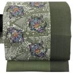 美品 名古屋帯 逸品 城間栄順 落款あり やまと 紬 草花 風景 灰緑 正絹 中古