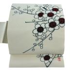美品 名古屋帯 逸品 人間国宝 森口華弘 落款あり 枝梅 金彩 縮緬 クリーム 正絹 中古