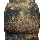 美品 袋名古屋帯 優品 草花 衝立 金糸 箔 紺色 正絹 中古