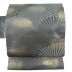 美品 名古屋帯 優品 葉柄 幾何学 箔 灰緑 正絹 中古