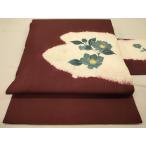 平和屋着物◎九寸名古屋帯 紬地 絞り 草花文 椿 葡萄色 正絹 逸品 DAAY4369jm