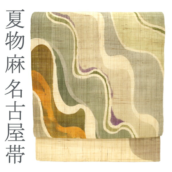 30%OFFで買えます¥48180→33726 【中古】 夏物 名古屋帯 リサイクル 九寸 麻 手描き 生成り色 ベージュ系 モダン柄 夏 カジュアル 未使用 仕立て上がり みやがわ sb50235