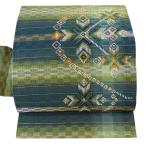 美品 名古屋帯 逸品 落款あり 工房 真南風 松葉風 草木染 幾何学 変わり市松 花織 緑 正絹 中古