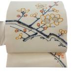 名古屋帯 逸品 人間国宝 森口華弘 落款あり 枝梅 金彩 クリーム 正絹 中古