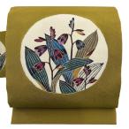 美品 名古屋帯 逸品 落款あり 伊差川洋子 草花 縮緬 鶯色 正絹 中古