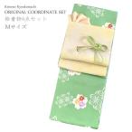 着物 4点セット 洗える 袷 Mサイズ 緑 麻の葉 きもの 黄色 花唐草 名古屋帯 薄オレンジ 正絹帯揚げ帯締め 帯 小紋 レディース 女性 プレタ 和装 和服