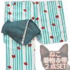 着物 セット ねこ柄 2点セット M 縞 白 緑 ストライプ 小紋 細帯 ポップ カジュアル 着物set 袷 和装 和服 きものセット BFセール