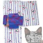 着物 セット ねこ柄 2点セット L 水色 縞 花輪 猫 小紋 ブルー 細帯 ポップ カジュアル ネコ 着物set 袷 和装 和服 きものセット BFセール