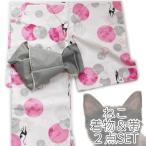 着物 セット ねこ柄 2点セット M 水玉 ピンク 猫 小紋 グレー 細帯 ポップ カジュアル ネコ 着物set 袷 和装 和服 きものセット BFセール