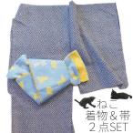着物 セット ねこ柄 2点セット M 疋田 紺 大粒 小紋 猫 水色 黄色 細帯 ポップ カジュアル ネコ 着物set 袷 和装 和服 きものセット BFセール