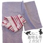 着物 セット ねこ柄 2点セット M 疋田 紫 大粒 小紋 猫 縞 ピンク 細帯 ポップ カジュアル ネコ 着物set 袷 和装 和服 きものセット BFセール