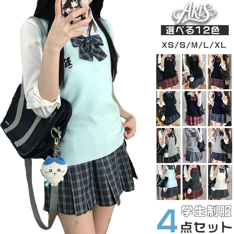 【先着50枚!15%OFFクーポン】4点セット スクールベスト 学生服 リボン ニットベスト 秋冬 Vネック 女子 韓国 韓国ファッション JK制服 女の子 小学生 学生服 入学式 高校生 学園祭 学園祭 大人 レディース 女子高生制服 大きいサイズ チェックスカート 薄手 春夏