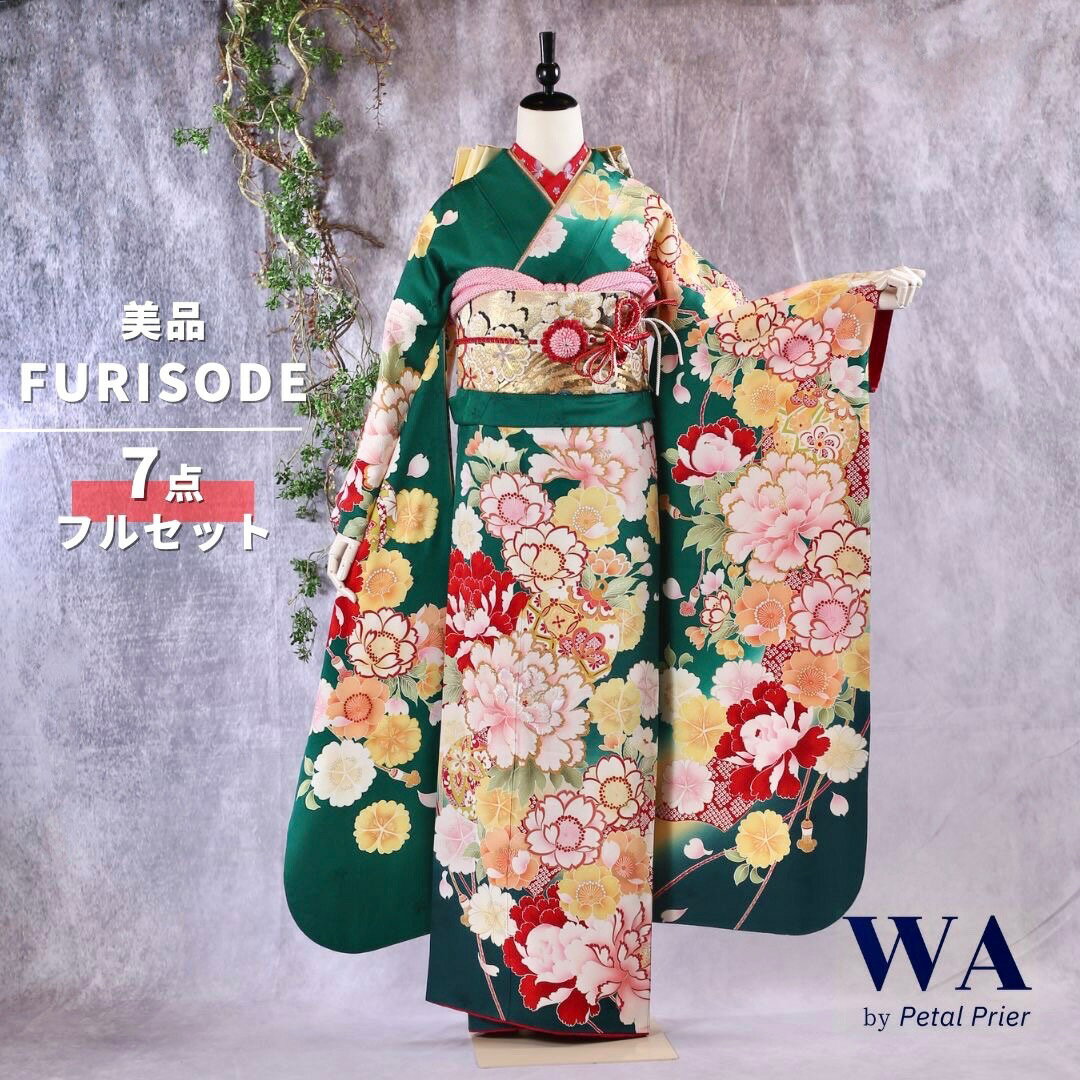 \30%OFF!/【中古】振袖 7点フルセット LLサイズ 振袖セット 振袖フルセット フルセット 成人式 着物 晴れ着 緑 深緑 古典 古典柄 モダン 牡丹 鞠 桜 鹿の子 帯 帯揚げ 重衿 半衿 帯締め 結婚式 ブライダル 十三参り KF-7
