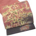 袋帯 中古 リサイクル 正絹 紬地 カジュアル 仕立て上がり お太鼓柄 作家物 落款 夾纈染 花鳥模様 赤茶色 多色 きもの北條 A1285-11