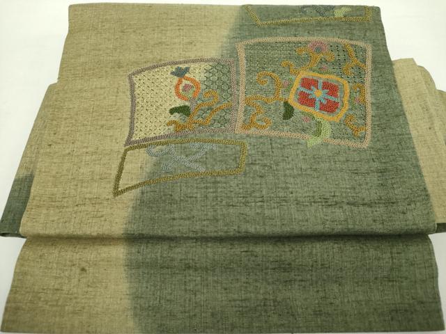 ys7497376; 板締め絞り相良刺繍花々に抽象模様洒落袋帯【着】