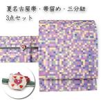 名古屋帯 帯留 三分紐 3点セット 紫 薄緑 黄地 モザイク格子柄 夏 帯 フォレストグリーン地 帯締め ポット 九寸 和装小物 レディース