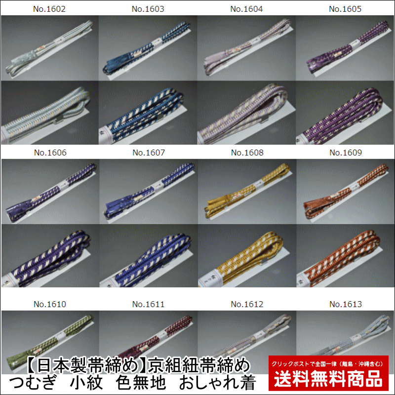 【送料無料】【期間限定】【日本製帯締め】京組紐帯締め(No.1602からNo.1613)つむぎ 小紋 色無地 おしゃれ着 【キモノ仙臺屋の和装小物特集】【お茶会帯締め】【お稽古帯締め】【踊り帯締め】