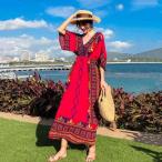 リゾートワンピースハワイ沖縄グアム10代20代30代40代50代ロングマキシ丈Vネック5分袖 民族衣装風海外旅行リゾートバカンス