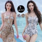 水着 「2点セット」パレオ付き フェイクレイヤード シアー スイム ワンピース レディース