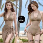 モノキニ 水着 オールインワン レディース ワンピース パレオ 2点セット ホルターネック サイド カットアウト 海 プール 夏 総柄