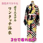 ワンタッチ浴衣 kjwy25-3 市松椿 白黒 女物 夏ゆかた ポリエステル浴衣 巻くだけ簡単 3分で着れます