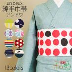 un deux アンドウ 綿 半幅帯 レディース 着物 浴衣 全13色ドット 麻の葉 紫 水色 ストライプ 黄色 斜め縞 よろけ波 金魚 つばめ 燕 亀甲 格子