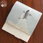 当店限定!! [夏帯] 夏名古屋帯 鯉の滝登り (麻/薄水色) リネン 日本製 名古屋帯 京袋帯 京袋名古屋帯 鯉 滝のぼり 龍 浴衣帯 単衣 浴衣 着物 召しませ花