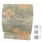 名古屋帯 新古品 正絹 グレージュ 金 正倉院文様 流水 観世水 リサイクル カジュアル 西陣織 引箔お洒落 仕立て上がり 九寸 No.i6-2406