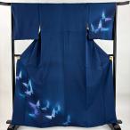 付下げ 身丈164cm 裄丈65cm M 袷 斉藤三才 落款あり 蝶 ぼかし 紺色 正絹 秀品 中古