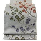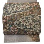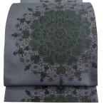 美品 袋帯 秀品 花柄 幾何学 金糸 箔 灰緑 全通 正絹 中古