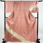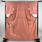 付下げ 身丈159.5cm 裄丈65cm M 袷 桧扇 草花 刺繍 絞り サーモンピンク 正絹 美品 優品 中古