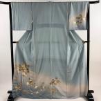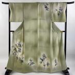 付下げ 身丈154cm 裄丈66cm M 袷 草花 霞 刺繍 金彩 灰緑 正絹 優品 中古