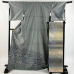 付下げ 身丈164cm 裄丈65.5cm M 袷 袋帯セット 鳥 草花 金糸 刺繍 灰緑 正絹 名品 中古